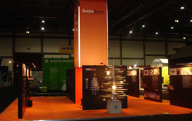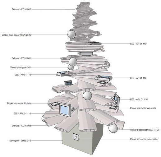 8 - A concrete block (Somague), forms the basis, which received inside a motor (Somague) to make the tree rotate when someone approaches the motion sensor (EFAPEL). The structure itself is made of Aluminium (Extrusal), and at the end of the "branches", the decorative elements such as mortar balls (Weber) and lamps (EEE) were applied.
