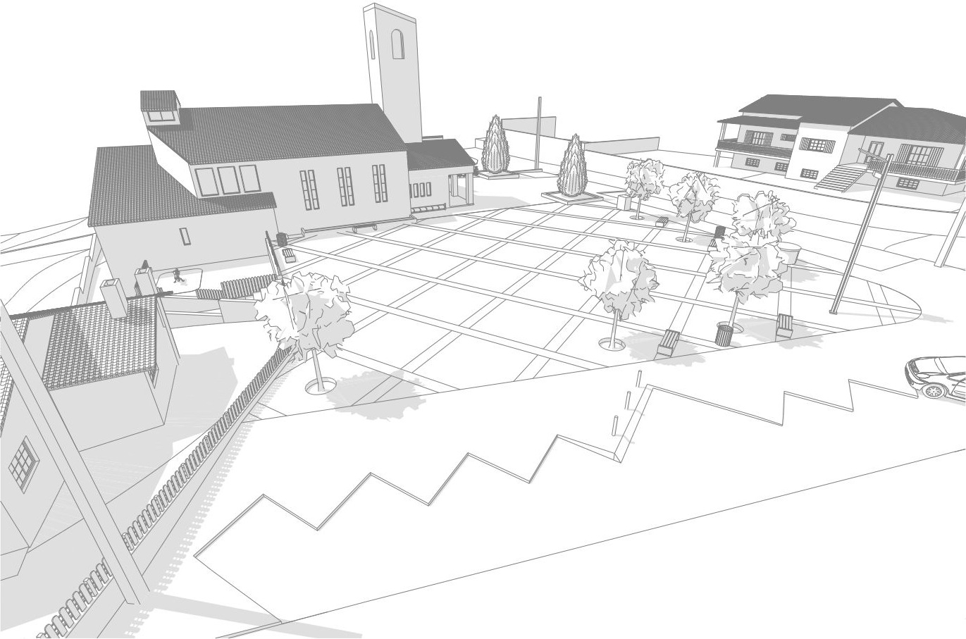 8 - Exploring the need to restructure the existing pavement, the parking lot has been extended so it can accommodate more places, having now a total capacity for 20 cars. A single lighting element was selected, creating a uniform light across the square.